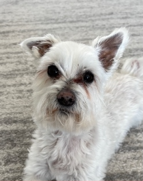 Maltese, white, 10 lbs. He’s calm, quiet and very friendly. I’ll never have another dog like him. Hope he lives a long time!
