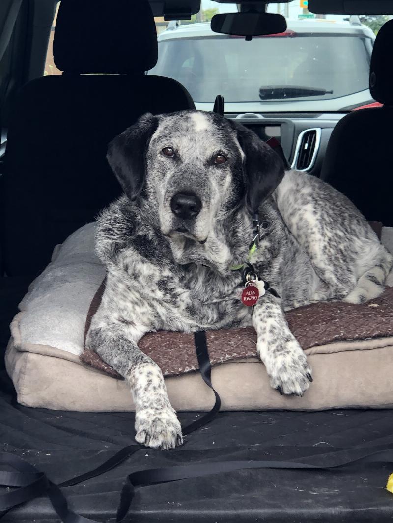 Tofu is laying in the back of my equinox, fit with his favourite bed for his comfort. He has the entire back of my SUV