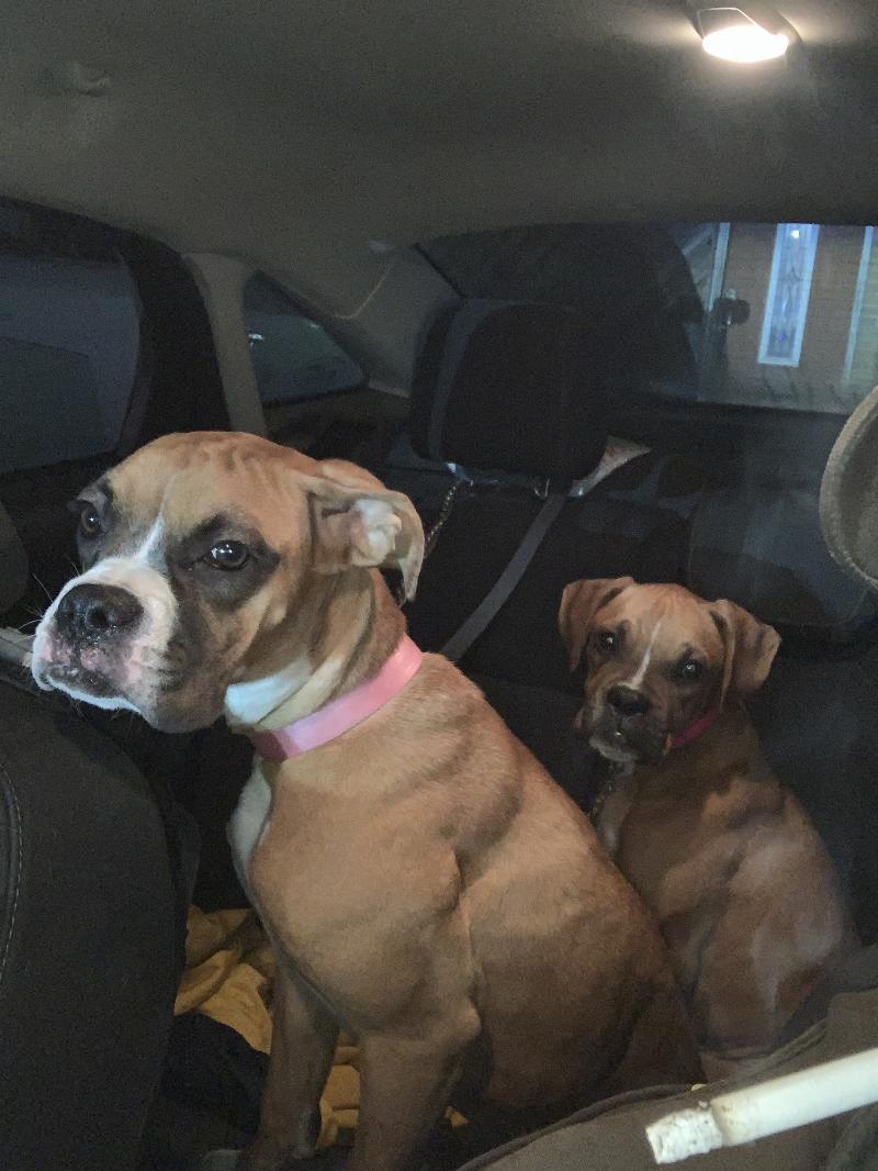 Treasure has the white face and my Lettie is laying down !! I love my buddys they help me make it through the day every day of the week !! Since this pic treasure has had me a little white baby boxer ! I call her justi