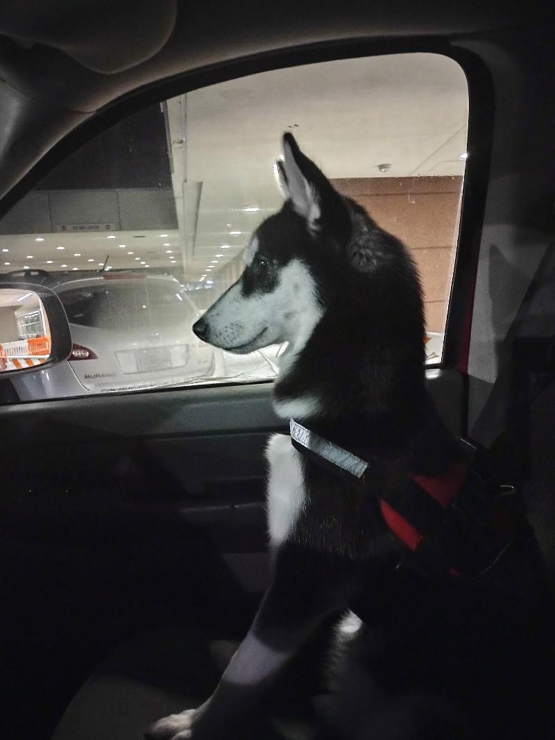 Sitting at attention while she watches out for loud groups of people. Crowds that are too loud are a trigger for us and she alerts us to them before they become an issue.