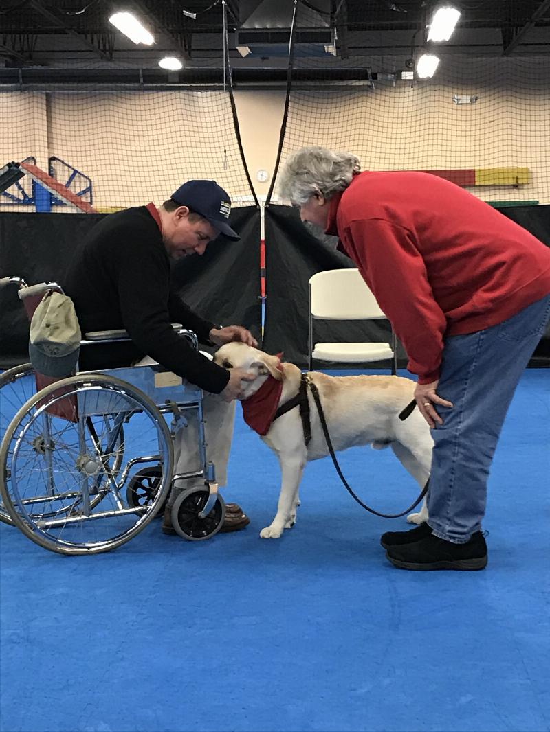 This photo was taken during Renny’s Therapy Dog Certification. It’s where a dog is trained to greet people who are confined to a wheelchair.