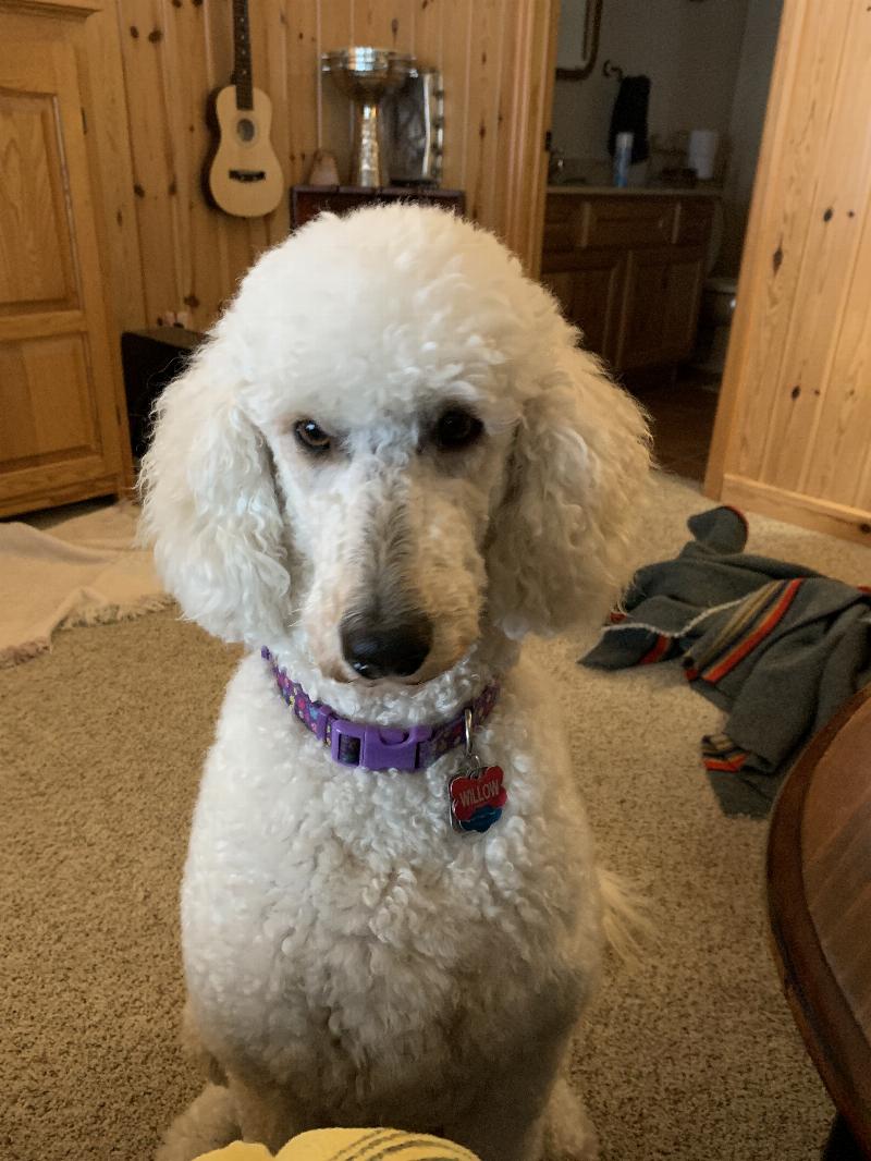 Willow is a two year old pleasant dog. She provides service to her handler by laying next to legs to calm them from moving.