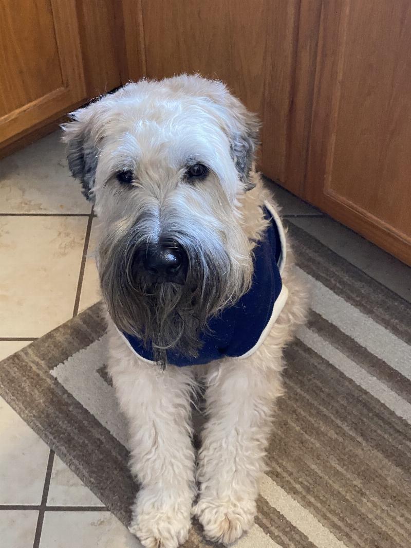 Winston is a soft coated Wheaton Terrier who came to me to help. He is a loving dog that services my needs. He is very loyal and knows when I need him.