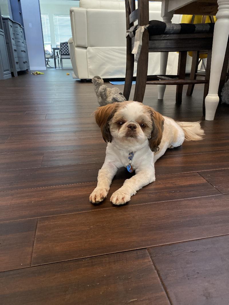 Zeke weighs 12#.  He is predominantly white with brown and liver color markings.  He has a scar on his right eye.  He injured it and has had surgery on it.