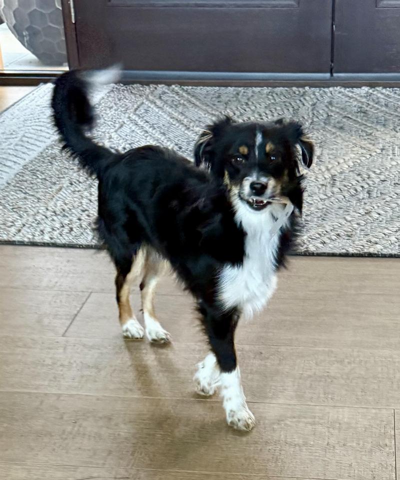 Australian Shepherd toy, female, tri color, black, white and brown. Born march 2025. micro chip number: 992000003943162